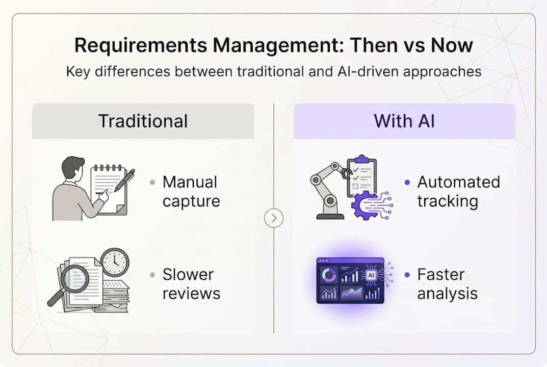 The table below illustrates how the shift from traditional to AI-driven approaches changes day-to-day requirement management: