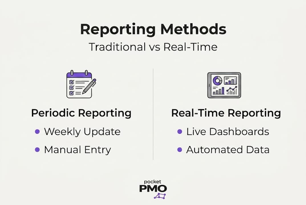 This is fundamentally different from traditional periodic reporting, where a project manager consolidates data manually, usually weekly or monthly, and distributes a static document. Periodic reports are snapshots. Real-time reports are a continuous stream. Both have a role, but they serve different purposes, and conflating them leads to wasted investment.