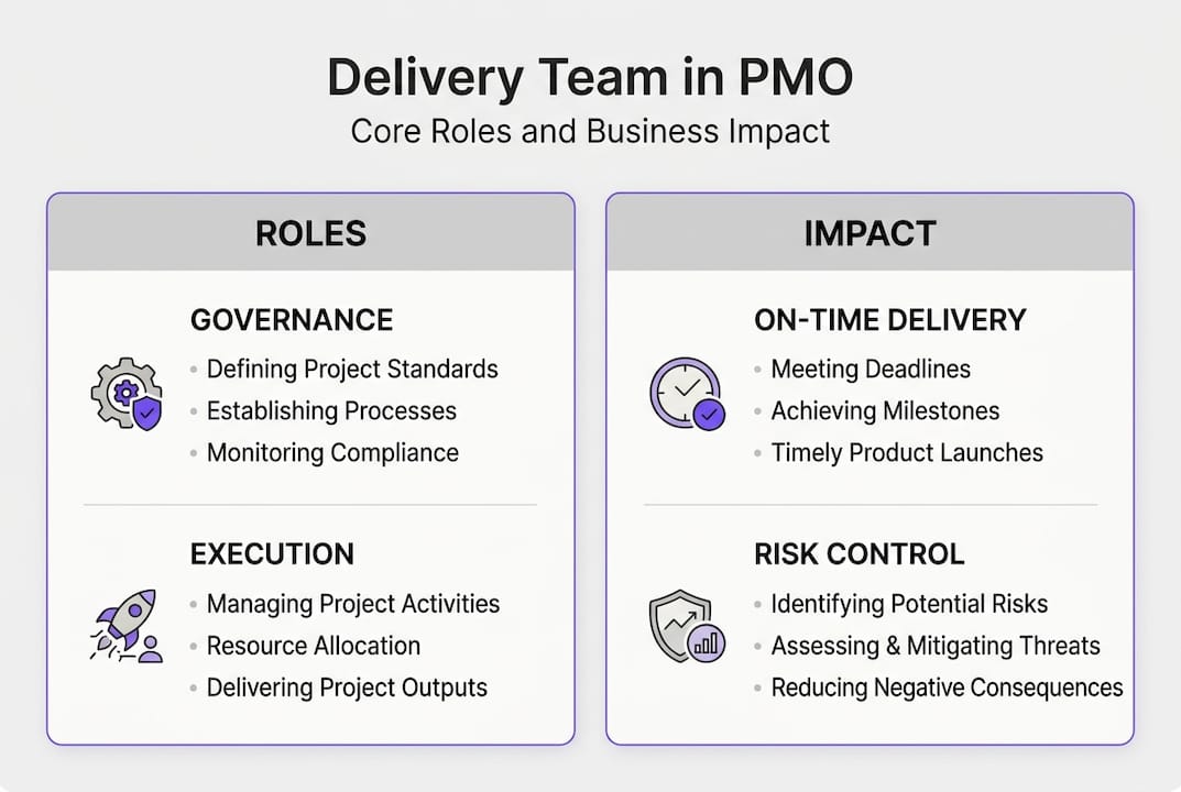 | Delivery teams enable execution | They bridge the gap between PMO strategy and actual project delivery. |